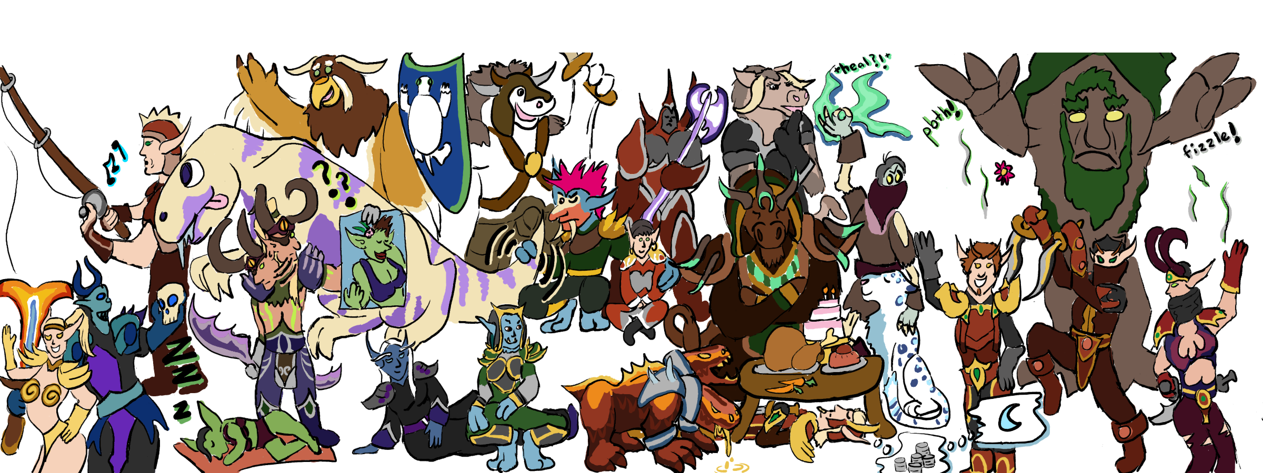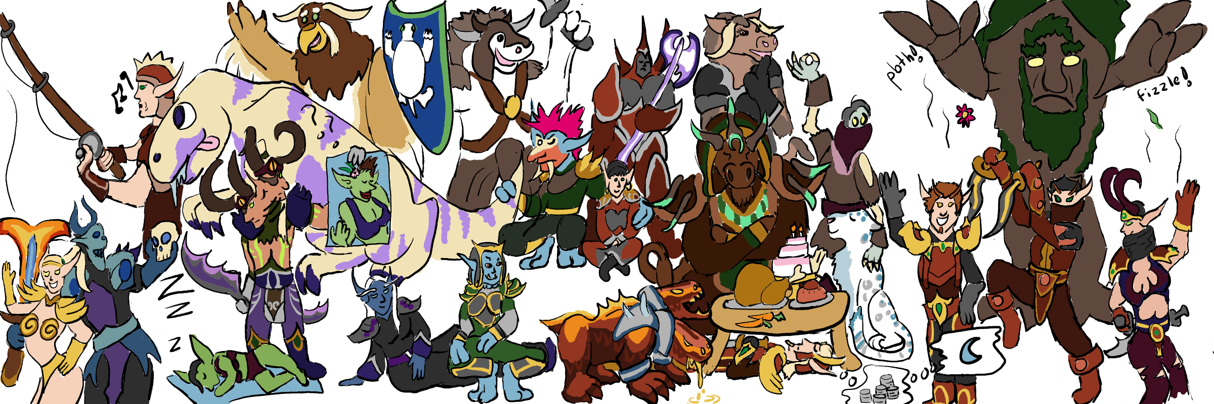 It is interesting to me to look back at some of these early plans and see things I had changed (or in GaGa’s case, that I had forgotten entirely). Tyrdan changed locations several times throughout the drawing process, as I attemped getting his long, prone body into a position in which you could see him clearly but would also not look out of proportion with everyone else. Krampus changed his pose to be holding a skull instead of a sword in his dominant hand, and Arrowkeys lost her bow. (A minor oversight, as in the final image, her hand looks a bit strange not clutching anything!) The biggest oversight I found between the preliminary sketch and the final lines was the lack of GaGa, and it is a large enough one I feel motivated to go back and correct at a later date. For now, you can see her next to Crom in the early sketch, taking up the position that the tauren moonkin representing Blakkthorne or Sunflower occupies in the final image.